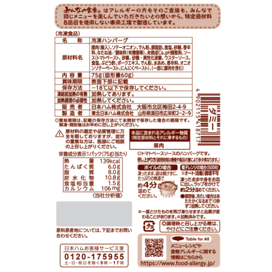 トマトベースのソースのハンバーグです。ハンバーガーや夕食のおかずなどにご活用ください。冷凍のためストック用としてもおすすめです。