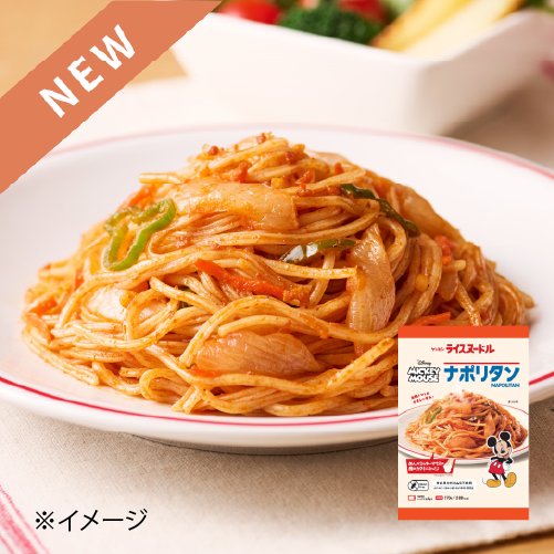 めんの断面がミッキーマウスの顔の形になった、冷凍ライスヌードルナポリタンです。